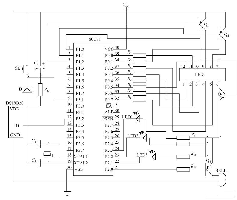 包括信號采集、系統(tǒng)控制、數(shù)字顯示、高溫報警四個部分。傳感器DS18B20 為信號采集器件所采集到的溫度信號,通過內(nèi)部處理由傳感器的DQ 端送到單片機P3. 2 端口,經(jīng)單片機的計算處理后,由P0 口和P1 口分別作為4 位共陽數(shù)碼管的段控信號和位控信號,共同完成對所測溫度值的數(shù)字顯示,最高位是符號顯示,如顯示負號“-”時,表示當前溫度是負溫度,否則為正溫度;由P2. 0 端口控制蜂鳴器,當測量的溫度超過“預(yù)設(shè)報警溫度”時,發(fā)出提示音報警; P2. 1~ P2. 3 端口來控制黃、綠、紅3 個發(fā)光二極管分別表示低溫、正常、高溫三種溫度狀態(tài)。石英晶體JT 和電容C2 ,C3 共同組成晶振電路; 電容C1 、電阻R 13、S B 共同構(gòu)成復(fù)位電路; 其中電阻R13為下拉電阻,SB 為手動復(fù)位按鈕。