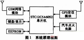 當(dāng)車主離開車輛時,即可啟動防盜系統(tǒng),首先車主需設(shè)置手機(jī)號,以備接收車輛的定位信息,此時,單片機(jī)控制GPS模塊,不斷獲取GPS定位數(shù)據(jù),并對獲取的GPS數(shù)據(jù)進(jìn)行分析,從而獲取包括車輛的經(jīng)、緯度以及速度等信息。系統(tǒng)通過車輛的速度或經(jīng)、緯度的變化來判斷車輛是否被移動,如果車輛被非法移動,單片機(jī)將控制GSM模塊將車輛的定位信息通過短消息,以每間隔十分鐘時間發(fā)送到車主指定的手機(jī)中,同時,單片機(jī)將此信息存儲在EEPROM中,以做將來的證據(jù)使用。車主第一時間知道車輛位置后,即可通過GSM遠(yuǎn)程網(wǎng)絡(luò)控制防盜系統(tǒng),切斷車輛的點火電路,使車輛熄火。同時,車主將車輛定位信息提供給警方,盡快找回自己的車輛。系統(tǒng)工作原理框圖見圖1。