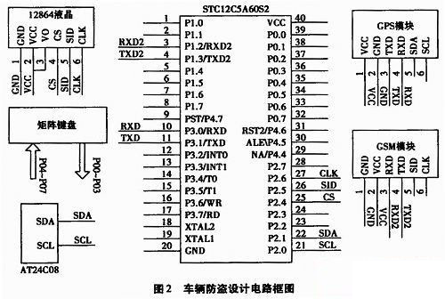 人機(jī)接口包括矩陣鍵盤和液晶顯示部分,主要用于實現(xiàn)預(yù)置的手機(jī)號碼的輸入、顯示和防盜功能的開啟與關(guān)閉功能。存儲器采用HC總線的EEPROM AT24C08,其為非易失性存儲器,存儲的數(shù)據(jù)可保存100年以上,并可進(jìn)行上萬次擦寫。單片機(jī)將GPS上接收來的數(shù)據(jù)進(jìn)行解析后,所獲得的車輛所處的經(jīng)、緯度,速度等信息保存在該存儲器中,為以后做為公安機(jī)關(guān)的證據(jù)依據(jù)。