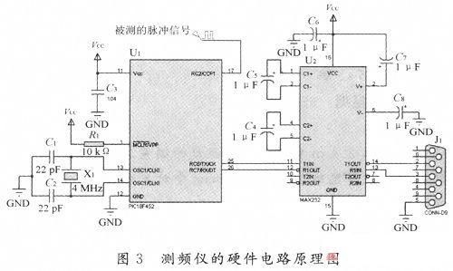 測頻儀的硬件電路主要包括兩個方面:頻率測量電路和數(shù)據(jù)通信電路。頻率測量是指使用PIC18F452的CCP模塊測量外部脈沖信號的頻率;數(shù)據(jù)通信是指將測量得到的數(shù)據(jù)通過串口傳至PC機(jī)進(jìn)行處理。測頻儀的硬件電路如圖3所示。