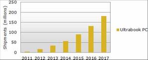 雖然最近兩年由于超薄筆電高售價與超薄顯示器供應(yīng)限制等因素,市場將無法快速增長;但是未來作為新型計算機(jī)產(chǎn)品,超薄筆電更時尚的設(shè)計、實(shí)時啟動和電池待機(jī)時間長等特性,有望于在預(yù)測后期拉動市場需求。到2017年,筆記型計算機(jī)預(yù)計將出貨4億3千2百萬臺。