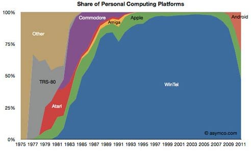 美國市場調研公司Asymco分析師賀拉斯·德迪歐(Horace Dediu)發(fā)布報告稱,傳統x86架構Windows PC(Wintel)在全球個人計算設備中的份額已經降至50%左右。在1995年至2005年期間,Wintel曾幾近完全壟斷個人計算設備。
