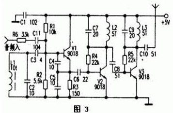圖4為晶振式發(fā)射機(jī)電路。電路中J.、VD1、L1、C3~C5、V1組成晶體振蕩電路。由于石英晶體J的頻率穩(wěn)定性好,受溫度影響也較小,所以廣泛用于無(wú)繩電話及AV調(diào)制器中。Vl是29~36MHz晶體振蕩三極管,發(fā)射極輸出含有豐富的諧波成分,經(jīng)V2放大后,在集電極由C7、L2構(gòu)成諧振于88-108MHz的網(wǎng)絡(luò)選出3倍頻信號(hào)(即87~108MHz的信號(hào)最強(qiáng)),再經(jīng)V3放大;L3、C9選頻后得到較理想的調(diào)頻頻段信號(hào)。頻率調(diào)制的過(guò)程是這樣的,音頻電壓的變化引起VD1極間電容的變化;由于VD1與晶體J串聯(lián),晶體的振藩頻率也發(fā)生微小的變化,經(jīng)三倍頻后,頻偏是29-36MHz晶體頻偏的3倍。實(shí)際應(yīng)用時(shí),為獲得合適的調(diào)制度,可選擇調(diào)制頻偏較大的石英晶體或陶瓷振子,也可以采用電路稍復(fù)雜的6-12倍頻電路。若輸入的音頻信號(hào)較弱;可加上一級(jí)電壓放大電路。