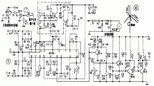 很多調(diào)頻立體聲模塊均將BAl404和外圍元件封裝在一個(gè)塑料或金屬外殼內(nèi)制成,只露出電源輸入、音頻輸入、射頻輸出引線,只要了解BAl404以后,就知道調(diào)頻立體聲模塊內(nèi)部是怎么一回事了。來(lái)自音源的立體聲音頻信號(hào)經(jīng)R1、R2、R5、C1、C3、C5(R4、R3、R6、C2、C4、C6)組成的網(wǎng)絡(luò)耦合到BAl404。經(jīng)IC內(nèi)部左(右)聲道放大,再進(jìn)行平衡調(diào)制,調(diào)制后的復(fù)合信號(hào)從IC的第14腳輸出,后與第13腳上的導(dǎo)頻信號(hào)通過(guò)B9、C15,B10、C16、C17構(gòu)成的網(wǎng)絡(luò)進(jìn)行混頻,混頻后的復(fù)合信號(hào)進(jìn)入IC的12腳,對(duì)比的⑧、⑨、⑩腳,C20--C22及髓組成的電容三點(diǎn)式振蕩器進(jìn)行調(diào)頻,IC的⑩腳上已調(diào)制的射頻信號(hào)經(jīng)內(nèi)部放大后從第⑦腳輸出,經(jīng)C18、L2選頻后送至天線TXl。要實(shí)現(xiàn)調(diào)頻立體聲,BAl404的⑤、⑥腳需外接38kHz晶體,但業(yè)余制作時(shí)的確很難購(gòu)得38kHz的專(zhuān)用晶體,所以在無(wú)該晶體的情況下,可以參考虛線內(nèi)的電路,用分立元件制作一個(gè)38kHz振蕩器,該38kHz信號(hào)經(jīng)過(guò)R8、C10送人IC第⑤腳。制作時(shí),Ll可用收音機(jī)中頻變壓器ITF—2—1、TTF-2-2或TFF-2-9等,同時(shí)注意引腳的連接不要搞錯(cuò),③腳接地,②腳接V1的發(fā)射極,①腳為反饋和輸出腳。通過(guò)調(diào)整其磁芯可以獲得頻率較穩(wěn)定、幅度足夠高的38kHz信號(hào)。