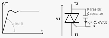 電壓上升率的抵制:dv/dt指的是在關(guān)斷狀態(tài)下電壓的上升斜率,這是防止誤觸發(fā)的一個關(guān)鍵參數(shù)。此值超限將可能導(dǎo)致可控硅出現(xiàn)誤導(dǎo)通的現(xiàn)象。由于可控硅的制造工藝決定了A2與G之間會存在寄生電容,如圖2所示。我們知道dv/dt的變化在電容的兩端會出現(xiàn)等效電流,這個電流就會成為Ig,也就是出現(xiàn)了觸發(fā)電流,導(dǎo)致誤觸發(fā)。