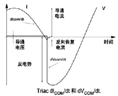 ②dICOM/dt (切換電流變化率) —導(dǎo)致高dICOM/dt值的因素是:高負(fù)載電流、高電網(wǎng)頻率(假設(shè)正弦波電流)或者非正弦波負(fù)載電流,它們引起的切換電流變化率超出最大的允許值,使雙向可控硅甚至不能支持50Hz 波形由零上升時不大的dV/dt,加入一幾mH的電感和負(fù)載串聯(lián),可以限制dICOM/dt。