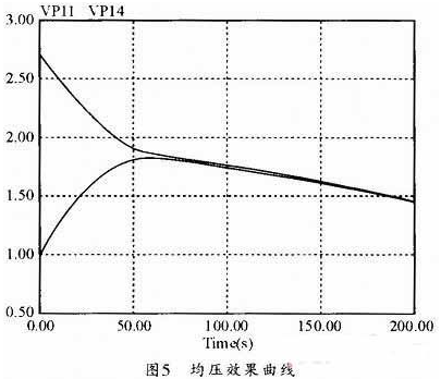 C1、C2初始電壓為2.7V,C3、C4為1V,仿真70s的時(shí)候基本均壓結(jié)束,電壓均衡到1.81V,由于電容并聯(lián)二極管的影響,電壓均衡點(diǎn)并沒有在算數(shù)平均值1.85V,并且升壓斬波器也消耗一部分能量。70s之后兩電容電壓基本保持同步變化。