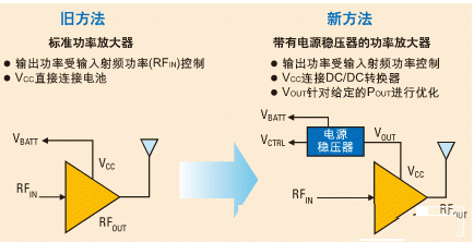 使用DC-DC轉(zhuǎn)換器(功率放大器電源穩(wěn)壓器)的主要目的是減少分母中的Pdc因子。當(dāng)功率放大器與電池直接相連時(shí),Pdc=Vbatt*Ibatt,而當(dāng)它使用功率放大器電源穩(wěn)壓器供電時(shí),Pdc=V o*I o?,F(xiàn)在我們能夠看出,為了增加PAE,V o和Io 必須低于Vbatt和Ibatt。這可以通過降低發(fā)射的射頻功率電平,降低功率放大器電源穩(wěn)壓器的輸出電壓來實(shí)現(xiàn)。這樣也降低了Io (功率放大器的吸收電流),并且由于DC-DC轉(zhuǎn)換器的高效性,電池的輸出電流也會(huì)降低。