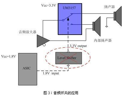 此外,英聯(lián)的低ICCT系列模擬開關(guān)具有更低的VIH電平值,可以使用較低的控制電平實現(xiàn)開關(guān)的高電平切換控制。產(chǎn)品的這種特性大大減少了系統(tǒng)工程師設(shè)計電路的復(fù)雜性,特別是在供電電源和控制信號電平不匹配的便攜產(chǎn)品應(yīng)用中可以免除使用電平轉(zhuǎn)換模塊,從而有效降低了成本。以模擬開關(guān)用來切換音頻信號為例,如圖3所示,可以使用ASIC傳輸過來的1.8V電壓直接來控制UM3157的控制管腳,而不必采用電平轉(zhuǎn)移器也能在實現(xiàn)開關(guān)切換的同時達(dá)到很小的漏電流。此外,由于低ICCT模擬開關(guān)不消耗很多功耗(大約1uA),且開關(guān)的導(dǎo)通電阻隨工作電壓的增加而降低,設(shè)計人員可以使用較高的供電電壓來達(dá)到更低的導(dǎo)通電阻。對于典型的音頻開關(guān)或USB應(yīng)用,低的導(dǎo)通電阻是非常重要的。
