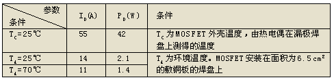 在DC/DC轉(zhuǎn)換器中,MOSFET工作在占空比變化的脈沖狀態(tài),但也不是工作于窄脈沖狀態(tài);工作溫度范圍是-40~85℃。表1、表2中無這種工作條件下的ID及PD值。ID可在下面的范圍內(nèi)選?。?TA=70~85℃時(shí)的ID)