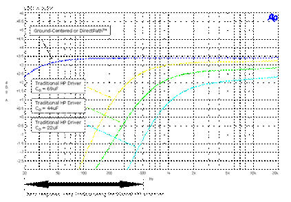 對(duì)于 100Hz 的截止頻率及 16Ω 的耳機(jī)喇叭阻抗,電容必須是 110μF。對(duì)于需要小體積尺寸的情況而言,這會(huì)造成電容值及實(shí)體尺寸過(guò)大,而且使得成本過(guò)高。許多工程人員只能改用 22μF 的較小電容,不過(guò)這會(huì)影響耳機(jī)的低頻率傳真度,而導(dǎo)致低音響應(yīng)不佳。