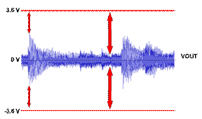 在 AB 類放大器的接地置中架構(gòu)做法中,放大器總是以最高電源電壓運(yùn)作,這表示,對(duì)于音頻的無(wú)噪聲階段而言,整個(gè)輸出 FET 的電壓降幅相當(dāng)大。以鋰離子電池為例,一般的電池電壓范圍是 3.0V 至 4.2V。假設(shè)電池供應(yīng) 3.6V 的電壓,圖 5 的紅色箭頭表示播放輸出音頻時(shí)整個(gè)輸出 FET 的電壓降幅。