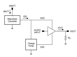 其中的技巧是設(shè)計(jì)將電池電壓降低至較低電壓的放大器,并使用適應(yīng)性電源軌 (分別有負(fù)電源軌) 降低播放音樂時(shí)整個(gè)輸出 FET 的電壓降幅。其中一種實(shí)現(xiàn)這類放大器的方式是,使用電荷泵作為圖 8 所示的步降區(qū)塊。某些工程人員偏好這類做法,原因在于步降電荷泵僅需要相對(duì)較小的飛馳電容(flying capacitor) (1μF 至 2.2μF),而這也是相對(duì)較小的組件