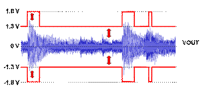 G 類放大器一般使用多個(gè)電源電壓,以發(fā)揮比 AB 類放大器更高的效率。在本例中,TI 最新的 G 類 DirectPath 放大器 (TPA6140A2) 首先將電池電壓降低至較低的電壓值,然后切換至低信號(hào)強(qiáng)度的低供應(yīng)電壓 (1.3V),并且只有在信號(hào)強(qiáng)度超出該低電源電壓軌時(shí),才切換至較高的電源電壓 (1.8V)。這些適應(yīng)性電源電壓軌的升降速度高于音頻,因此可避免失真或削波。此外,由于一般聆聽的音頻低于 200mVRMS,因此電源電壓通常是最低值 (亦即 1.3V),并且提供優(yōu)于上述 AB 類放大器的效率。在音頻的無(wú)噪聲階段期間,整個(gè)電源軌的電壓會(huì)降低,而且信號(hào)相當(dāng)小。當(dāng)音頻變得大聲時(shí),放大器會(huì)切換至較高的電源軌,然后切換回較低的電源軌,導(dǎo)致整個(gè)輸出 FET 的電壓降幅縮小。圖 7 的紅色箭頭表示此電壓降幅。