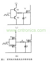 圖1(a)為常用的小功率驅(qū)動(dòng)電路,簡(jiǎn)單可靠成本低。適用于不要求隔離的小功率開(kāi)關(guān)設(shè)備。圖1(b)所示驅(qū)動(dòng)電路開(kāi)關(guān)速度很快,驅(qū)動(dòng)能力強(qiáng),為防止倆個(gè)MOSFET管直通,通常串接一個(gè)0.5~1Ω小電阻用于限流,該電路適用于不要求隔離的中功率開(kāi)關(guān)設(shè)備。這兩種電路結(jié)構(gòu)特簡(jiǎn)單。
