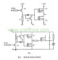 功率MOSFET屬于電壓型控制器件,只要柵極和源極之間施加的電壓超過(guò)其閾值電壓就會(huì)導(dǎo)通。由于MOSFET存在結(jié)電容,關(guān)斷時(shí)其漏源兩端電壓的突然上升將會(huì)通過(guò)結(jié)電容在柵源兩端產(chǎn)生干擾電壓。常用的互補(bǔ)驅(qū)動(dòng)電路的關(guān)斷回路阻抗小,關(guān)斷速度較快,但它不能提供負(fù)壓,故其抗干擾性較差。為了提高電路的抗干擾性,可在此種驅(qū)動(dòng)電路的基礎(chǔ)上增加一級(jí)由V1、V2、R組成的電路,產(chǎn)生一個(gè)負(fù)壓,電路原理圖如圖2(a)所示。