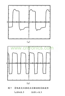 6(b)為占空比大于0.5時(shí)適用的驅(qū)動(dòng)電路,其中Z2為穩(wěn)壓二極管,此時(shí)副邊繞組負(fù)電壓值較大,Z2的穩(wěn)壓值為所需的負(fù)向電壓值,超過(guò)部分電壓降在電容C2上,其實(shí)驗(yàn)波形見(jiàn)圖7(b)。