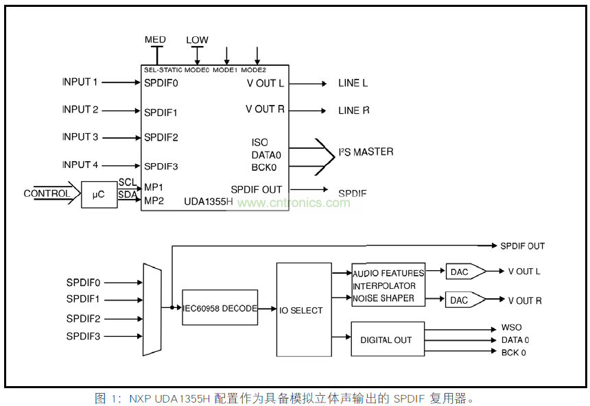 圖 1 顯示了配置為 1/4 SPDIF 的多路復(fù)用器,有模擬立體聲輸出的 NXP UDA1355H。請注意,復(fù)用器中選擇的SPDIF 信號也可以傳輸?shù)?SPDIF 輸出,使組件可以使用菊花鏈,保持?jǐn)?shù)字域音頻,維持音頻質(zhì)量。因此,可以很容易地實(shí)現(xiàn) 1/(3n+1)多路復(fù)用器,其中第 n 個(gè)DAC,I2S 或 SPDIF 作為主復(fù)用輸出。如果這是所需要的全部,通過簡單將 SEL_STATIC引腳設(shè)置為高( 靜態(tài)模式),而不是中(I2C 模式),僅使用 UDA1355H無須微控制器就可以實(shí)現(xiàn)。