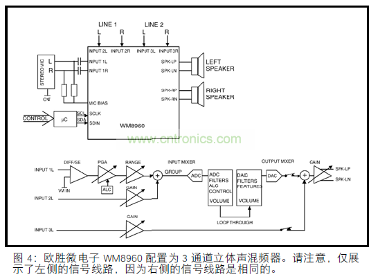 其它功能包括主音量,自動音量控制,環(huán)繞立體聲和低音增強(qiáng)。SGTL5000 還提供了一個(gè)集成的耳機(jī)放大器。第三個(gè)設(shè)備,來自歐勝微電子的 WM8960,是目前編解碼器中高水平集成技術(shù)的代表。此部分顯示在圖 4 中,已配置為立體聲麥克風(fēng)和兩個(gè)立體聲線路級源的立體聲混頻器,帶有直接(D 類)揚(yáng)聲器驅(qū)動器。它還包括一個(gè)片載耳機(jī)驅(qū)動器,連接 16Ω 負(fù)載,功率可達(dá) 40mW。