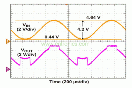 為了測試該電路,我們將VCC/2 = 5V DC偏移的300 Hz正弦波應(yīng)用于輸入端。在VOUT出現(xiàn)變化以前,一直對AC幅值進行調(diào)節(jié)。如圖4所示,當應(yīng)用10 Vp-p輸入時,VOUT在正軌附近出現(xiàn)一個經(jīng)削波的信號,而非負軌附近。如果輸入超出VCC – 0.8V(本例中為9.2V),這種正軌附近出現(xiàn)的非理想行為是我們能夠預(yù)計到的。9.2V以下VIN電平和低至0V時,VOUT顯示出正確的波形,正如我們所預(yù)期的那樣。