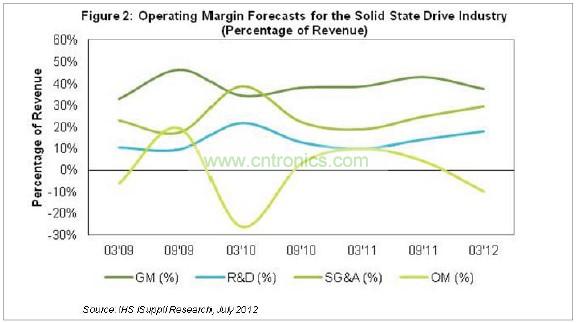 上次SSD產(chǎn)業(yè)出現(xiàn)營業(yè)利潤普遍為負(fù)的情況是在2010年上半年,與目前的情形類似。當(dāng)時,幾家廠商加大銷售力度,以改善略高于35%的毛利率。這些努力取得了一些效果,2011年中期毛利率自2009年以來首次升到了40%以上。但由于產(chǎn)業(yè)競爭加劇和營業(yè)費用增加,SSD毛利率在2011年第四季度重新跌至40%以下。