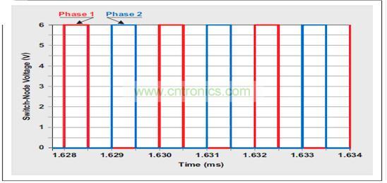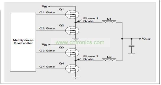 圖1 顯示了一款二相電路。由該電路的波形(圖2 所示)可以清楚地看到各相互相交錯。這種交錯可減少輸入和輸出紋波電流。另外,它還減少了印刷電路板或者某個特定組件上的熱點(diǎn)。實(shí)際上,二相降壓轉(zhuǎn)換器讓FET 和電感的RMS-電流功耗降低了一半。相交錯還可以降低傳導(dǎo)損耗。