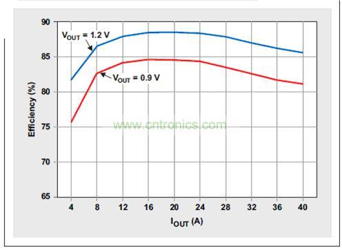 由于每個相位的功率級電流更低,多相實(shí)現(xiàn)的輸出濾波器要求也隨之降低。對于一款40-A 二相解決方案來說,向每個電感提供的平均電流僅為20A。相比40-A 單相方法,由于平均電流和飽和電流更低,電感和電感器體積都大大減小。