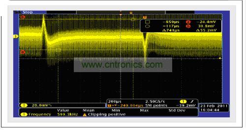 圖10 瞬態(tài)響應(yīng):10-A負(fù)載步長20 µs(過沖/下沖約27 mV)