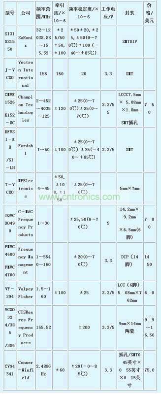 隨著現(xiàn)代無(wú)線通信系統(tǒng)向高頻、寬帶、便攜式方向發(fā)展,要求VCXO具有高頻、高性能、頻率范圍寬、線性度好、頻率穩(wěn)定度優(yōu)、頻率牽引誤差小、噪聲低和封裝尺寸小等特性。世界上各先進(jìn)國(guó)家競(jìng)相開發(fā)與生產(chǎn)高水平的產(chǎn)品來(lái)滿足日益增長(zhǎng)的市場(chǎng)需求。表1為美國(guó)十大著名VCXO廠商生產(chǎn)的VCXO品種、性能和價(jià)格1。