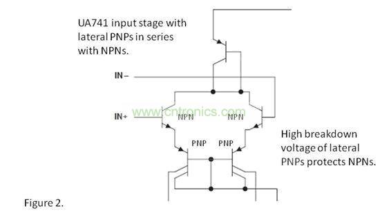 一般而言,雙極NPN 晶體管運算放大器都有輸入鉗位,例如:OP07、OPA227 和OPA277 等。uA741 是一個例外,它具有NPN 輸入晶體管,并且有一些為NPN 提供固有保護(hù)的附加串聯(lián)橫向PNP。