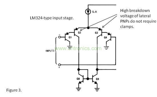使用橫向PNP 輸入晶體管的通用運算放大器一般沒有輸入鉗位,例如:LM324" target="_blank" title="Link to Product Folder">LM324、LM358" target="_blank" title="Link to Product Folder">LM358、OPA234" target="_blank" title="Link to Product Folder">OPA234、OPA2251" target="_blank" title="Link to Product Folder">OPA2251 和OPA244" target="_blank" title="Link to Product Folder">OPA244。這些運算放大器一般為“單電源”類型,其意味著它們擁有一個擴展至負(fù)電源端(或者稍低)的共模范圍。輸入偏置電流為一個負(fù)數(shù)時,表示輸入偏置電流自輸入引腳流出。這時,我們通常可以認(rèn)定它們?yōu)檫@類運算放大器。但是,需要注意的是,使用PNP 輸入的高速運算放大器一般有輸入鉗位,而這些PNP 是一些具有更低擊穿電壓的垂直PNP。
