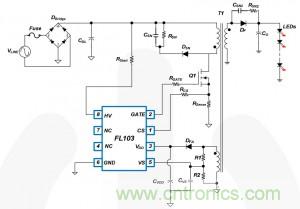 低功率照明包 括蠟燭、照明球燈泡和 20W 以下的白熾燈。 這些是小燈泡,主要用于住宅和零售場(chǎng)所。 尺寸和成本是兩個(gè)最大的關(guān)注點(diǎn),所以使用初級(jí)端調(diào)節(jié) (PSR) 拓?fù)涫且粋€(gè)很好的選擇。 一個(gè) PSR 控制器僅使用 LED 燈控制器初級(jí)端的信息來精確控制輸出電壓和電流。 消除了輸出電流檢測(cè)損耗并取消了次級(jí)反饋電路。 結(jié)果是設(shè)計(jì)用更少外部元件,滿足更緊密的恒定輸出電流要求。 一個(gè) 20W 的 LED 負(fù)載,以 80% 的功率啟動(dòng),熱損失約 4W。 圖 1 是一個(gè)使用 FL103 的電路樣本,飛兆 FPS™ 功率開關(guān)器件,是一個(gè)帶 PSR 功能的控制器。