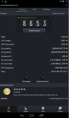 同樣是雙核產(chǎn)品,RK3168在整體性能發(fā)揮上得到了兩倍于A20的分?jǐn)?shù),不難看出RK3168在這項對比上具有壓倒性的優(yōu)勢。A20受限CortexA7的發(fā)揮,在內(nèi)存和CPU浮點性能等方面表現(xiàn)較差,整體性能只能達(dá)到單核A9的水平。