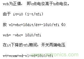因此,在關(guān)斷過(guò)程一開(kāi)始,vt立即從零上升到vcem,it在從i0下降至零期間,vt=vcem不變。直到it=0、id=i0以后,vt才下降為電源電壓vd,如圖5(b)所示。vcem超過(guò)vd的數(shù)值取決于lб、tfi和負(fù)載電流i0,顯然過(guò)快的電流下降率di/dt(即tfi小)、過(guò)大的雜散電感l(wèi)б或負(fù)載電流過(guò)大都會(huì)引起關(guān)斷時(shí)元件嚴(yán)重過(guò)電壓,且伴隨著很大的功耗。