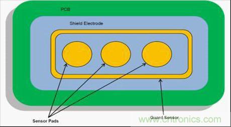 因電容式感應(yīng)鈕令家電外觀時(shí)尚,避免磨損問(wèn)題,因此,相對(duì)機(jī)械按鈕成為了首選技術(shù)。許多家電要在液體附近使用,需要有防水功能,以免有水情況下造成假觸發(fā)。圖1顯示了電容式傳感器印刷電路板(PCB)的典型布局。將圍繞傳感器(藍(lán)色)的交叉網(wǎng)格(hatched pattern)連接至保護(hù)電極(而不是接地)就可實(shí)現(xiàn)防水功能。
