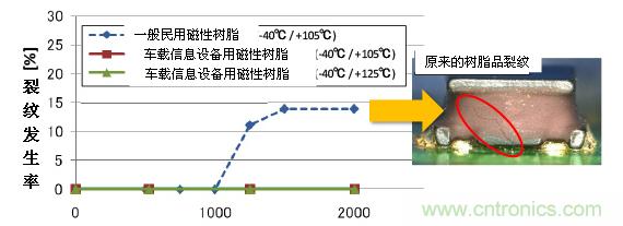 熱沖擊投入周期數(shù)和裂紋發(fā)生率的關(guān)系如圖3所示。一般民用市場(chǎng)的磁性樹(shù)脂在1000輪以下就會(huì)產(chǎn)生裂紋,而我們開(kāi)發(fā)的車(chē)載信息設(shè)備用磁性樹(shù)脂在2000輪之后仍然沒(méi)有產(chǎn)生裂紋。并且確保即使在更嚴(yán)厲的-40℃⇔+125℃環(huán)境下的熱沖擊試驗(yàn)中也不會(huì)產(chǎn)生裂紋。