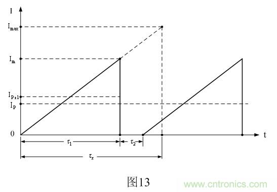 這里順便介紹一下電流平均值Ip的求法,以及其與最大電流Im和極限電流Imax的關(guān)系。圖13是電流平均值Ip與最大電流Im和極限電流Imax之間的關(guān)系圖。