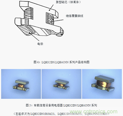 LQH32DN、LQH43NN系列是為了適應大電感值領域的車載電感市場的需求所設計的,它的最高使用環(huán)境溫度可達105℃,是一種無磁性樹脂型的繞線電感器。為了降低由于鼓型磁芯開裂及絕緣覆膜銅線的熱膨脹收縮引起的斷線風險,因而采用了無樹脂結(jié)構。結(jié)構概略圖如圖4,產(chǎn)品照片如圖5所示。
