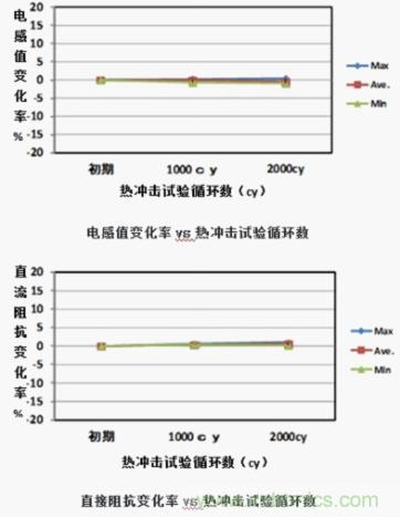 圖6、7所示為關于LQH43NN222K03在-40℃↔+105℃/2000循環(huán)熱沖擊試驗前后的外觀照片,主要電氣特性的變化。在熱沖擊試驗后,沒有發(fā)現(xiàn)鼓形磁芯的開裂及電線斷線等不合格現(xiàn)象。另外,關于主要的電氣特性,變化率也控制在±1%以內(nèi),是滿足了車載用元器件性能要求的產(chǎn)品。