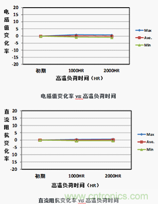 在圖8中,顯示了對于LQH43NN222K03在+105℃環(huán)境下,接通額定電流后的高溫負荷試驗中的主要電氣特性變化。電氣特性的變化在±1%以內(nèi),外觀未發(fā)現(xiàn)明顯異常。通過采用耐熱性等級高的電線,在高溫環(huán)境下也能保持高可靠性。