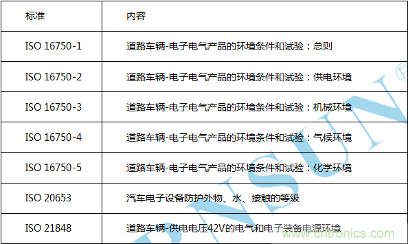 ISO 16750 系列標(biāo)準(zhǔn)是國(guó)際標(biāo)準(zhǔn)化組織ISO 最近幾年推出的針對(duì)汽車電子的環(huán)境可靠性標(biāo)準(zhǔn),該標(biāo)準(zhǔn)是歐系車常用的標(biāo)準(zhǔn),并且逐漸被世界各國(guó)轉(zhuǎn)化為國(guó)家標(biāo)準(zhǔn),也逐漸被各企業(yè)標(biāo)準(zhǔn)所引用,成為應(yīng)用比較廣泛的汽車電子的環(huán)境可靠性標(biāo)準(zhǔn)。該系列標(biāo)準(zhǔn)包括五個(gè)部分: