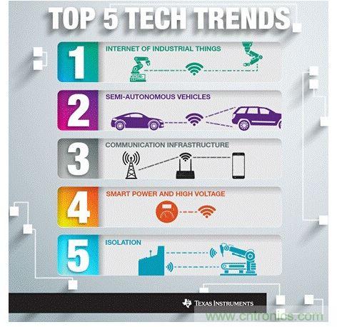 在迎接2015到來之際,我們有必要花時(shí)間來評(píng)估和預(yù)測(cè)未來的一年中將會(huì)出現(xiàn)的技術(shù)挑戰(zhàn)和突破創(chuàng)新。通過與眾多戰(zhàn)略客戶、大學(xué)合作伙伴以及TI產(chǎn)品線的技術(shù)專家進(jìn)行探討后,我們認(rèn)為TI將在一些重要技術(shù)趨勢(shì)中發(fā)揮戰(zhàn)略性作用。這些技術(shù)趨勢(shì)正推動(dòng)著汽車和工業(yè)等多個(gè)市場(chǎng)的發(fā)展,而在此過程中,TI的工程師將幫助應(yīng)對(duì)半導(dǎo)體技術(shù)領(lǐng)域的獨(dú)特挑戰(zhàn),并利用先進(jìn)技術(shù)改善我們的生活。