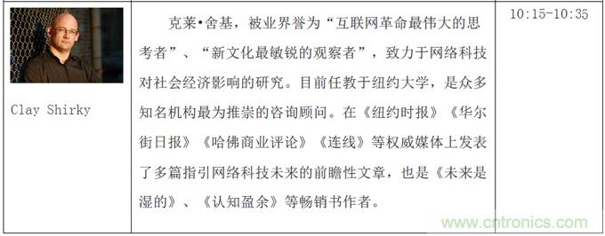 本次創(chuàng)客論壇三天共三個(gè)主題:啟蒙創(chuàng)新、創(chuàng)客本質(zhì)和協(xié)同合作,將邀請到包括暢銷書《失控》作者Kevin Kelly、克萊舍基、Arduino開源電子原型開發(fā)平臺(tái)聯(lián)合創(chuàng)始人Massimo Banzi、第一個(gè)生物創(chuàng)客空間BioCurious聯(lián)合創(chuàng)始人Tito Jankonski、F.laobo的制作人和ArduinoFio的設(shè)計(jì)者Shigeru Kobayashi、Intel最小的實(shí)習(xí)生Joey Hudy和為麻省理工研究生授課的14歲電子神童QuinEtnyre等等共50余位來自全世界各地的創(chuàng)新領(lǐng)域領(lǐng)軍人物。