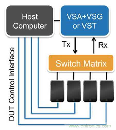 此類因素顯著增加了測試時間,繼而增加了測試成本。新的解決方案是芯片組供應(yīng)商、測試廠商以及最終用戶通過并行測試多臺 設(shè)備來最大限度提高效率,這一方法也稱為“多DUT”測試。通過利用最新的多DUT測試軟硬件架構(gòu),設(shè)備制造商可以顯著增加他們的生產(chǎn)測試吞吐量而不會增加測試成本。這里來研究和比較各種多DUT測試方案,其中圖2所示的方案是使用一個VSA+VSG或VST通過一個開關(guān)矩陣來測試4個DUT。