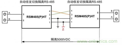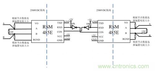 RS485的應用中,有時需對信號進行增強,或不同的RS485網(wǎng)絡之間進行電氣隔離,輸入和輸出都是RS485信號,此時需用到RS485的中繼器。而基于RSM485系列,可快速搭建簡易的隔離型RS485中繼器,如圖2 和圖3所示。