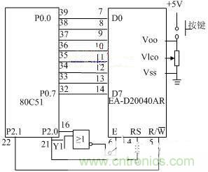 LCM點陣式液晶顯示模塊能顯示的字符多,并且能顯示漢字,因而在智能化測量控制儀表中得到了廣泛的應(yīng)用。本系統(tǒng)選用的是EPSON公司生產(chǎn)的EA-D20040AR點陣式液晶顯示模塊,它由TN型液晶顯示器、CMOS驅(qū)動器和CMOS控制器組成,模塊內(nèi)集成有字符發(fā)生器和數(shù)據(jù)存貯器,采用單±5V電源供電,內(nèi)部有能顯示96個ASCII字符和92個特殊字符的字庫。EA-D20040AR與單片機(jī)80C51的接口電路如圖4所示: