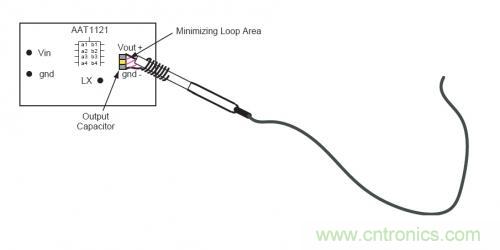 在測(cè)量中,如何減小拾取的輻射噪聲?最簡(jiǎn)單可靠的方法是采用一個(gè)接地環(huán)來測(cè)量電源紋波以及噪聲。為了進(jìn)一步的降低測(cè)試誤差,可以將示波器探頭和地線直接放在電源輸出電容得兩端。如下圖所示,采用這種方法,在信號(hào)探頭和地線之間的環(huán)路面積很小,所以測(cè)量中帶來誤差的噪聲幾乎可以忽略。