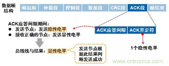 應(yīng)答間隙:所有接收到匹配CRC序列(CRC SEQUENCE)的節(jié)點(diǎn)會在應(yīng)答間隙(ACK SLOT)期間用一“顯性”的位寫入發(fā)送器的“隱性”位來作出回答,由于CAN總線線與的原理,只要總線上有一個節(jié)點(diǎn)正確接收到數(shù)據(jù),則ACK SLOT就會被填入顯性電平。