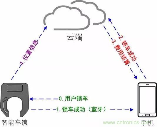 1.手機(jī)先掃單車上二維碼,而后向云端發(fā)起解鎖請求(請求中會攜帶掃碼單車的ID信息及用戶個人賬號信息)。云端對用戶信息、單車信息進(jìn)行核查,而后將授權(quán)信息發(fā)送給手機(jī)。(步驟1、2)