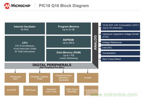 新型ATtiny1607系列采用緊湊型3 x 3 mm 20引腳QFN封裝,針對空間受限的閉環(huán)控制系統(tǒng)(如手持式電動工具和遙控器)進行了優(yōu)化。 該系列器件不僅集成了高速模數轉換器(ADC),提高模擬信號轉換速度從而產生確定性系統(tǒng)響應,還提高了振蕩器精度,使設計師能夠減少外部元件并節(jié)省成本。 PIC18 Q10系列的CIP包括互補波形發(fā)生器 (CWG)外設,可簡化復雜的開關設計;帶計算功能的模數轉換器 (ADC2),可在硬件中執(zhí)行高級計算和數據過濾,完全無需內核干預。 此類CIP讓CPU能夠執(zhí)行人機接口 (HMI) 控制等更復雜的任務,并在無處理需求時保持低功能模式,實現節(jié)能。